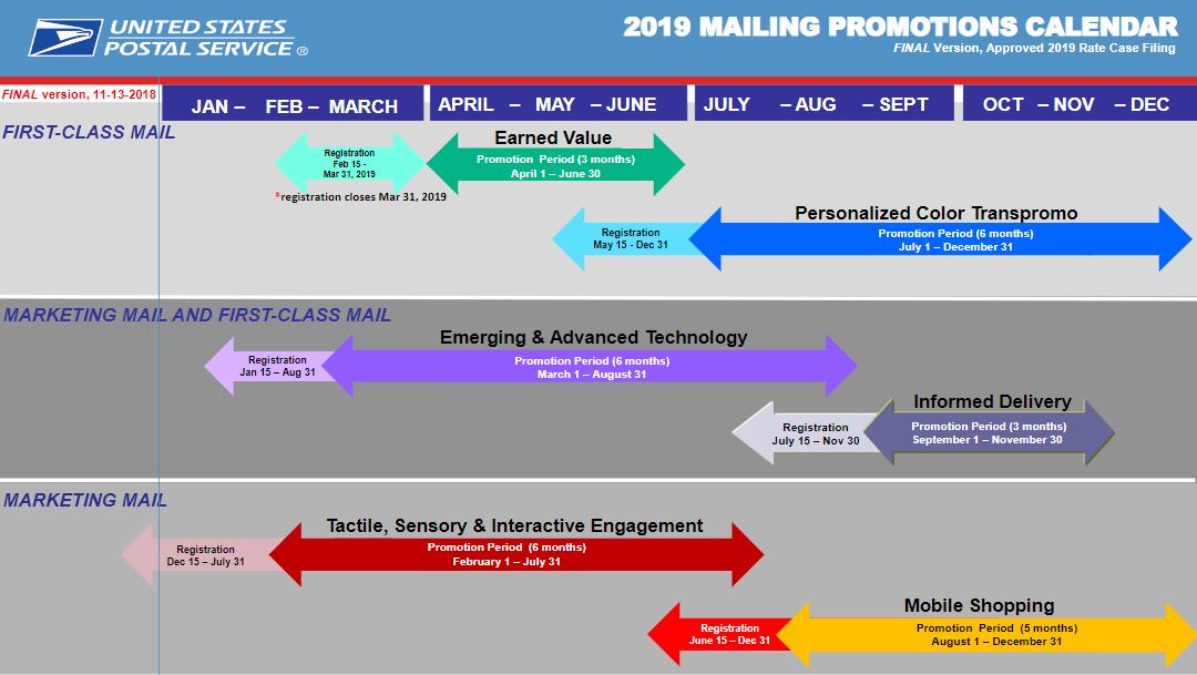 After a one year hiatus, the Postal Service® has announced mailing promotions for 2019. For the past few years the Postal Service has offered mailing promotions and price incentives to create awareness for new and innovative uses of mail. Due to the absence of any presidentially-appointed governors, they did not have the authority to establish promotional pricing for 2018.