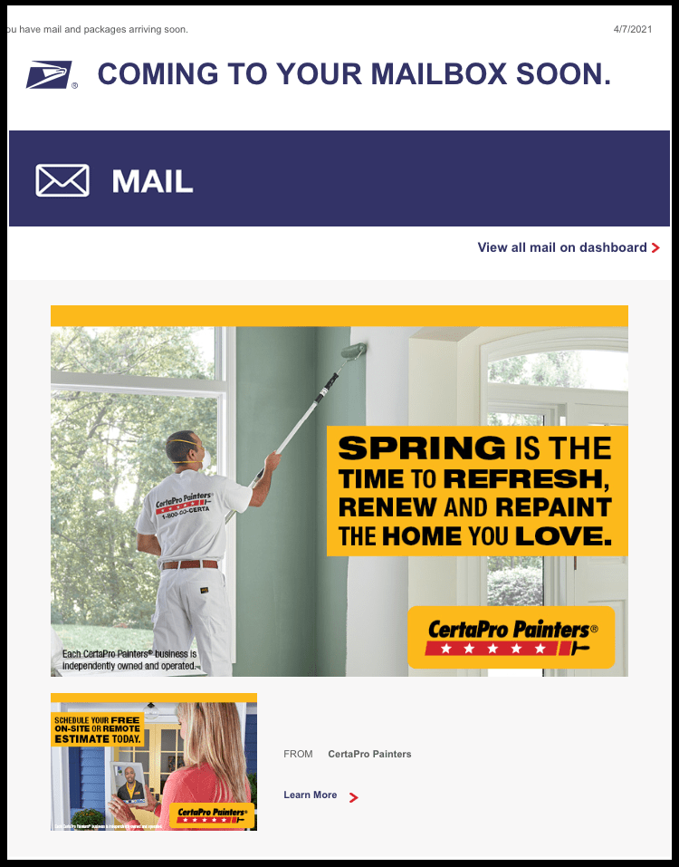 However, business mailers can take the program a step further by adding a small color ad that links to a web page – creating an interactive digital and mail campaign. A color image can also replace the black and white image of the mail piece. The color ad and mail piece image will stand out in a consumer’s Informed Delivery notifications, giving them a sneak peak of the mail piece that will soon be delivered in their mailbox. They can also click on the link in the ad and respond immediately to the offer via the web page. When the mail piece is delivered, it reinforces the offer and provides a second opportunity for the recipient to respond.